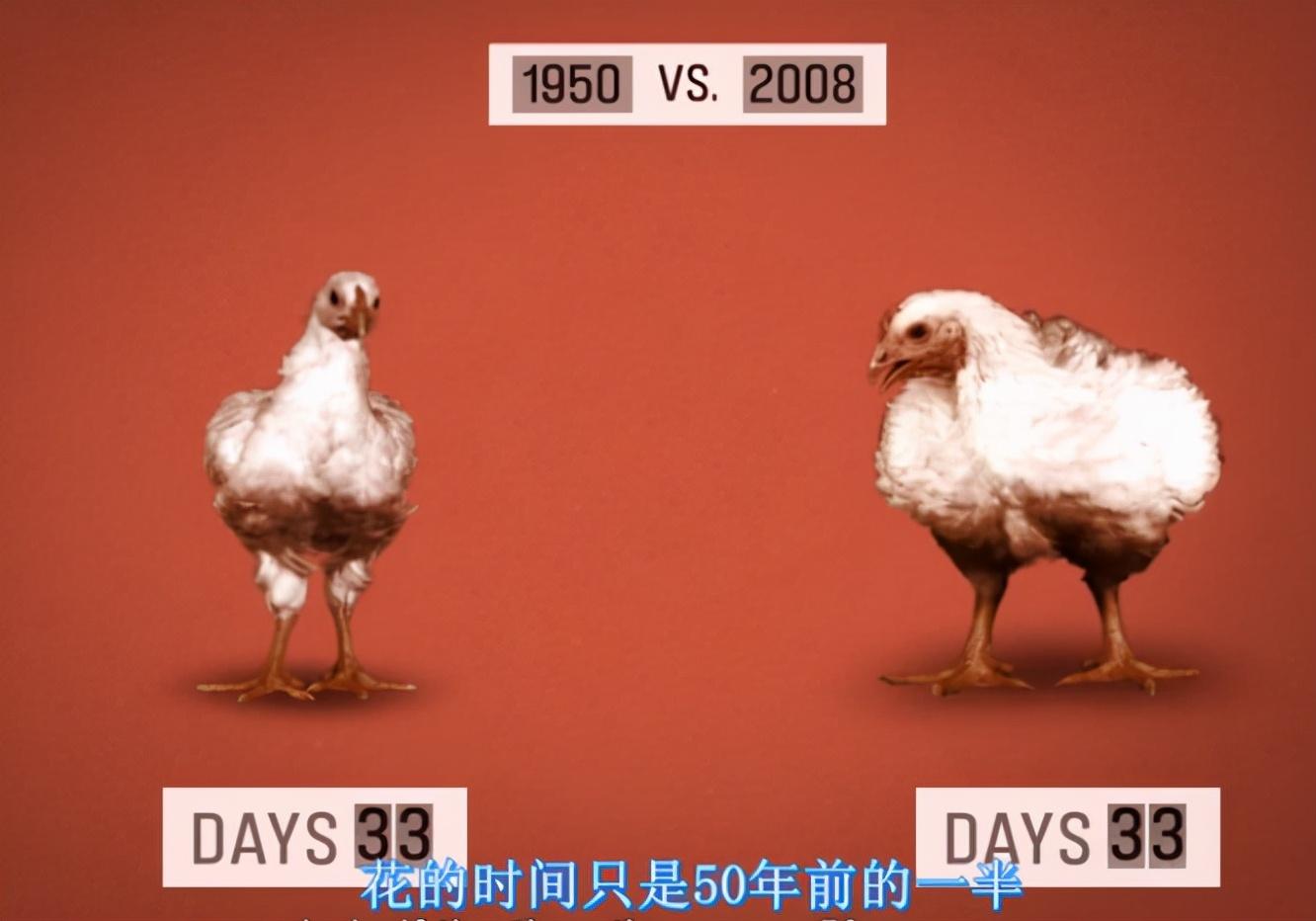 为了最大程度地牟利,它们精心配种出体型大、鸡肉多、饲养期短的大肉鸡。与1950年相比,2008年就在市场普及的大肉鸡,饲养期短了20多天,重量却高出了2倍。