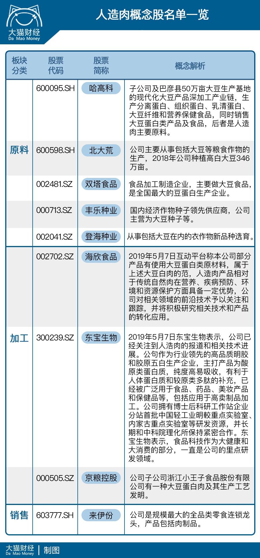 其实A股中的“人造肉”概念股还处在炒作主题阶段,并没有生产出像Beyond Meat公司一样口感的产品,不过随着A股上市公司逐步加大科技研发和布局人造肉市场,并不一定比国外公司竞争力弱。尤其是在中国这个肉产品消费大国中,人口基数大,哪怕有很少比例的市场份额,也会成长出一些“人造肉”巨头,更何况还有海外市场的成长空间。因此,猫哥整理了一份